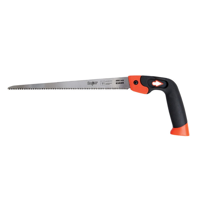 Описание и особенности: Профессиональная ножовка для фигурного распила древесины. Обрезиненная противоскользящая рукоятка. Инструментальная сталь У8. Трехгранная заточка. Импульсная закалка зуба. Длина: 300 мм.